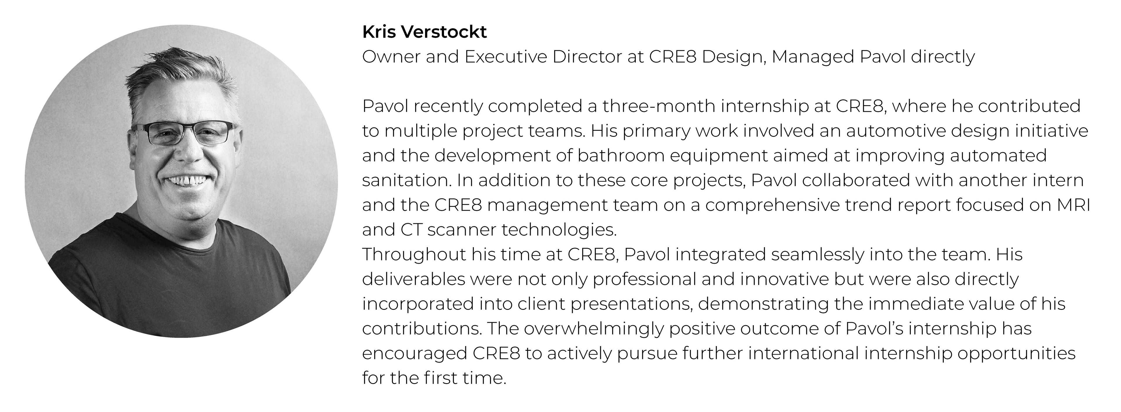 Ambitious multidisciplinary industrial designer born in Slovakia, graduated and currently working in Czechia, with experience of studies and internships in Taiwan, always thirsty for new adventures. Trained in a field of design and engineering, with a master's degree in industrial design and professional experience in execution of multiple projects. Utilizing skills and knowledge in industrial design, prototyping and manufacturing processes, with experience in logo, visual identity and packaging design.