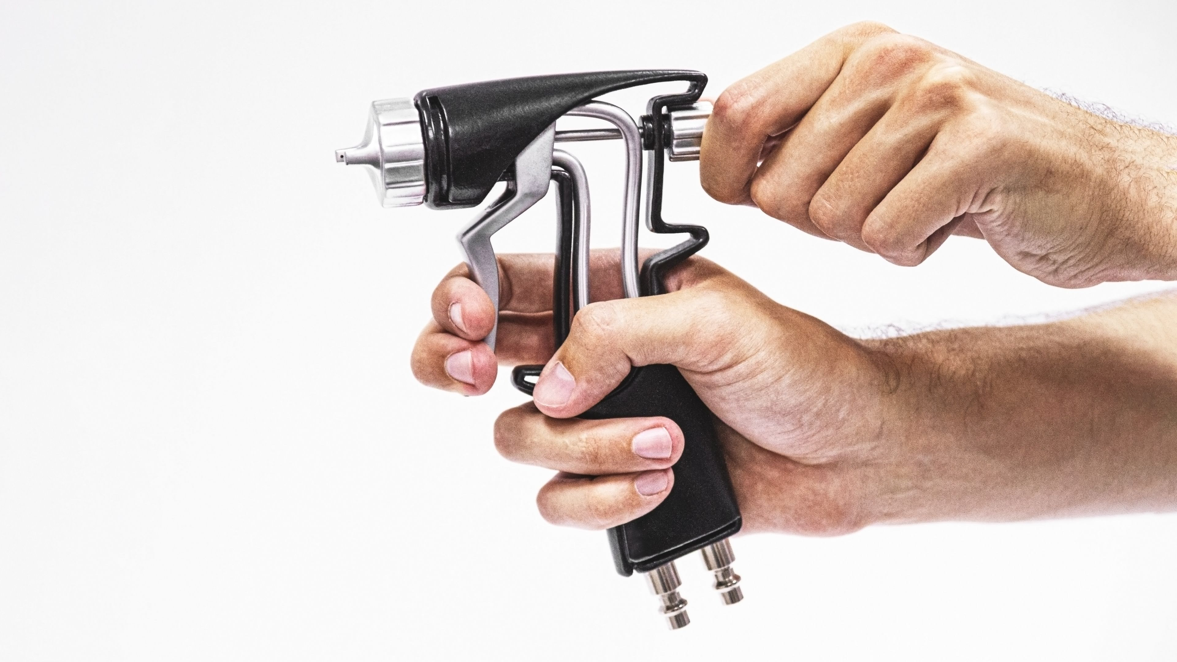 Ergonomy of the handle is designed with the aim to enable the user to find the most comfortable and stable grip position. The rotatable knob and nozzle’s ring have significant grooves for better handling, over the needle’s knob there is a hook for hanging the gun while not using it. Exposed inlet tubes accent the raw look and correspond with the usual environment of usage.